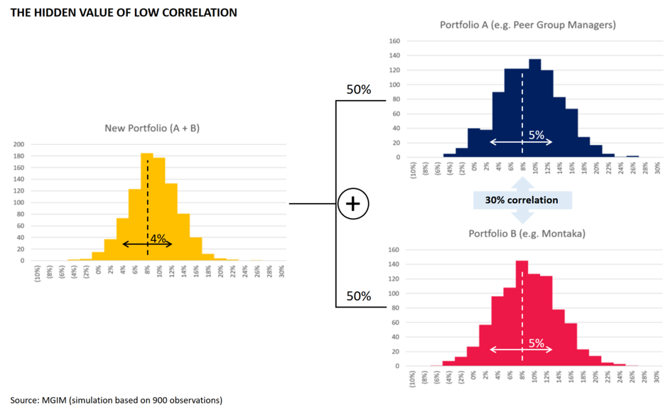 - Then, by blending strategies with low correlations – even without any difference in skill level to generate returns – one can reduce their overall portfolio risk.